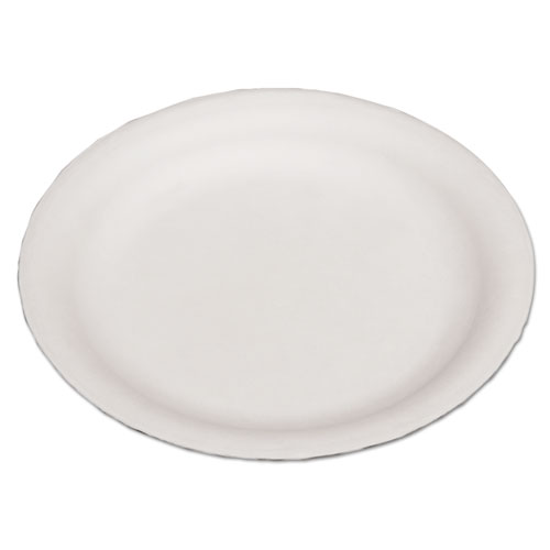 Premium-strength, disposable paper plates with a flat-bottom, nesting design, are made from molded pulp and certified compostable. Plates are water- and grease-resistant.