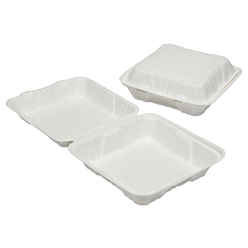 Bio-based pulp food containers with hinged lids and secure closures are ideal for transporting and storing hot or cold foods. Square microwaveable containers have high insulation qualities yet resist grease.
