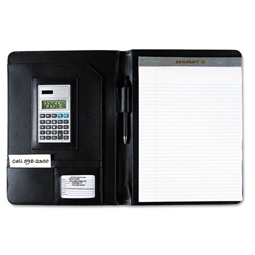 7510014844563, SKILCRAFT Black Leather Look Portfolio, Solar Calculator/Writing Pad/Pen