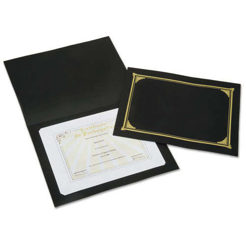 Present and preserve your award certificates with a touch of class. Elegant gold-foil trim design. Constructed of heavy-linen stock. Reinforced die-cut slots to hold documents in place. Can be placed in vertical or horizontal position.