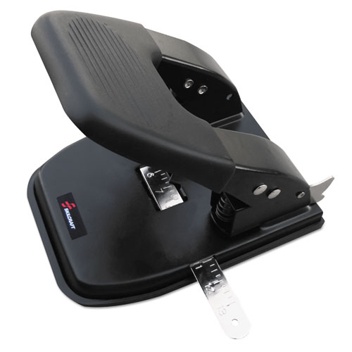 Two-hole punch features a protective rubber base that prevents work surface scratches and sliding. Spring-loaded handle reduces punching effort. This standard-duty device punches round holes, spaced 2 3/4" apart. An adjustable paper guide locks at common paper sizes.