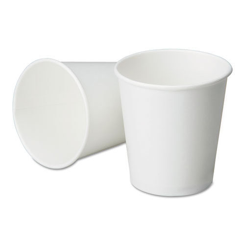 Cup without handles is constructed for hot beverages. Features a round tapered design for easy stacking, a plastic coating on the inner surface and a rolled edge for easy handling. Cup is both odorless and leak proof. Elemental chlorine-free (ECF).