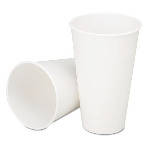 Cup without handles is designed for cold beverages. Features a round tapered design for easy stacking, a plastic coating on the inner surface and a rolled edge for easy handling. Cup is both odorless and leak proof. Cups are elemental chlorine-free (ECF). Meets FDA requirements.