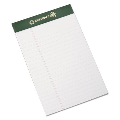 An alternative to traditional paper products, these perforated writing pads are made using a 100% chlorine free manufacturing process, helping to preserve aquatic wildlife and the environment from the harmful effects of chlorine. Pads feature a green leatherette strip embossed with both gold SKILCRAFT and recycle logos. Legal ruled 20-lb. paper is attached to a sturdy backer board.