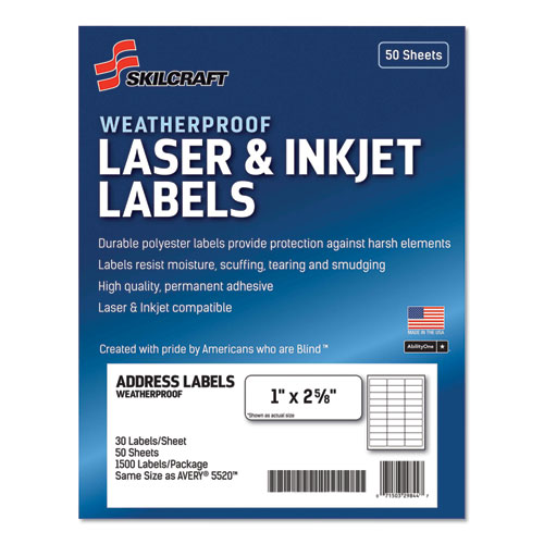 7530016736516 Skilcraft Weatherproof Mailing Labels, Laser Printers, 1 X 2.63, White, 30/sheet, 50 Sheets/box
