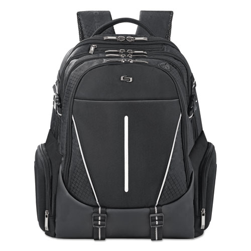 Fully padded 17.3" laptop compartment. Internal iPad®/tablet pocket. Hardshell side zippered pockets protect most headphones. Built-in headphone port. Three full size compartments. Quick access pocket. Front zip-down organizer section. Padded shoulder straps with chest strap for added comfort. Cooling air mesh back padding. Reflective strip for increased visibility. Lightweight.