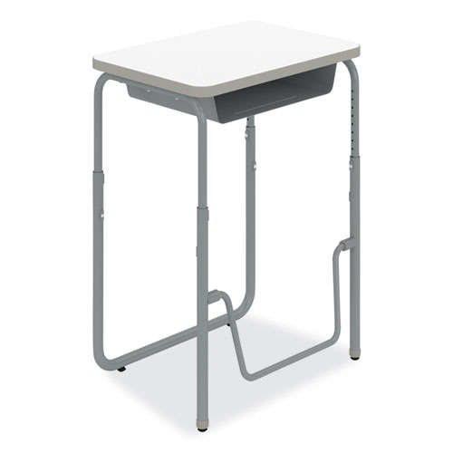 Encourage healthy movement and provide convenient storage with the AlphaBetter 2.0 height-adjustable student desk that features a high-pressure laminate top and under-surface book box. This desk comfortably accommodates students of all sizes as they work or sketch ideas. A pendulum footrest allows students to redirect excess energy and continue to move, even as they sit, providing ergonomic support, increasing comfort, and promoting cardiovascular health. Great for boosting productivity and focus, this student desk has the added benefit of optional casters for better mobility throughout the classroom, and a convenient book cubby right beneath the desktop. Height adjusts accommodating students in 5th grade and up as well as adults at seated and standing heights.