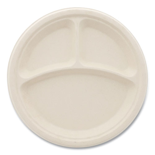 Bagasse PFAS-Free Dinnerware, Plate, 10" dia, 3-Compartment, Tan, 500/Carton