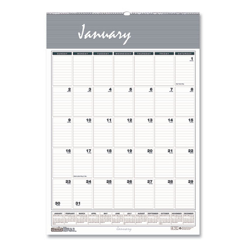 Ruled daily blocks keep notations neat. Full-year reference calendar aids in planning throughout the year. Neutral graphics match any décor. Wirebound with a full chipboard backer and a sturdy wire hanger. Made entirely of recycled materials.