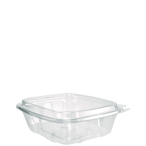 No matter what's inside, these containers keep your food safe, secure and looking good! Designed to prevent tampering without shrink bands or extra wrapping, our containers make sharing food easy. Keep contents fresh and prevent leaks with the secure perimeter seal. The tamper alert hinge has a visible seal that, if broken, makes it obvious the container has been opened. The specialty lid inhibits the ability to lift it from the base without tearing the hinge. Once the seal is broken, the now two-piece container is easy to re-close and continues to be leak-resistant. Make sure your food is the star of the show thanks to the crystal-clear material. Merchandising and delivery is a breeze the sturdy stackable design. They're even great for at-home use. Transport salads, fruits, or desserts to your next picnic, potluck, or bake sale.