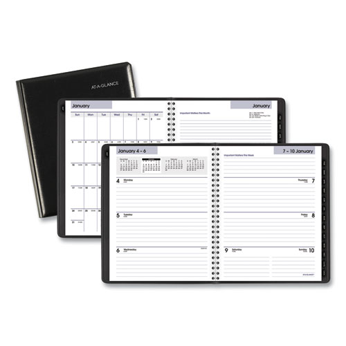 Planning with a professional touch. Keep track of the big picture on the monthly spreads while planning out the meticulous details on the weekly spreads. Weekly spreads feature plenty of planning and notes space for appointments, events and important tasks. Tabbed, monthly spreads feature a block calendar on the left and a full page for notes on the right. Robust appendix, designed specifically for busy executives, provides a variety of useful planning and reference resources to simplify your life. Padded, simulated leather cover looks like it belongs out in the open, in a top-floor, corner office, while the cover's concealed twin-wire binding minimizes the potential for snags, no matter how boldly you stride forward. High-quality paper delivers superior ink-bleed resistance to keep everything looking sharp.