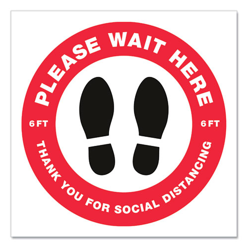 Social Distancing Floor Decals, 10.5" Dia, Please Wait Here, Red/white Face, Black Graphics, 5/pack
