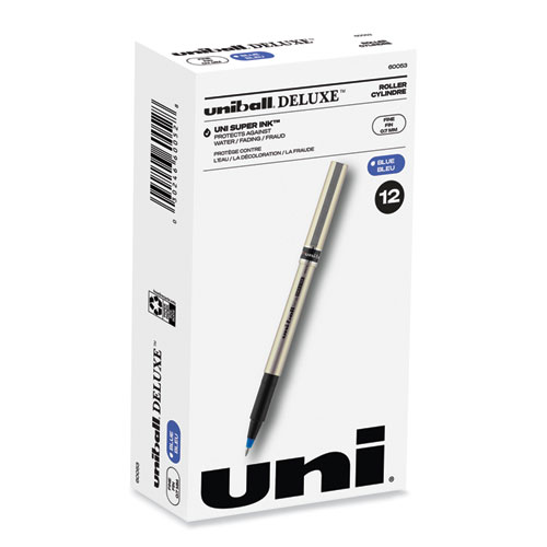 Introduce sophisticated style to your everyday writing with Deluxe Rollerball Stick Pens from uni-ball featuring a strong, long lasting tip. Even-flowing, acid-free liquid ink delivers a smooth writing experience for intense, vibrant lines. Deluxe delivers crisp lines with unparalleled definition, making it easy to create super fine details in your drawings and diagrams. Capped roller pens are useful for a variety of tasks from note taking and list making to signing checks and legal documents. Innovative uni Super Ink technology forms a strong bond with the paper, protecting from water, fading and fraud. Up your writing instrument sophistication with the matte black, brushed steel barrel of the Deluxe capped rollerball pens.