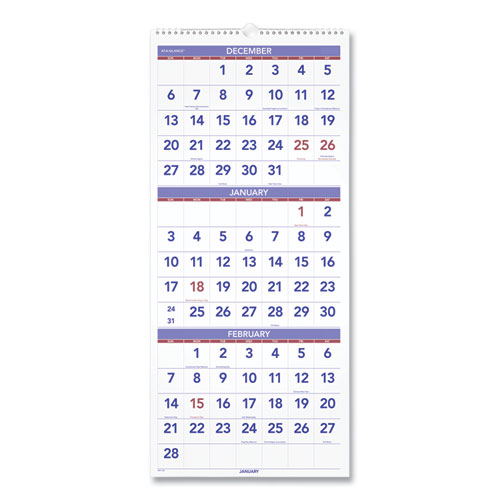 Three-month per page view: past, current and future months. Large, easy-to-read numbers. Federal holidays highlighted. White wirebound with hanging loop.