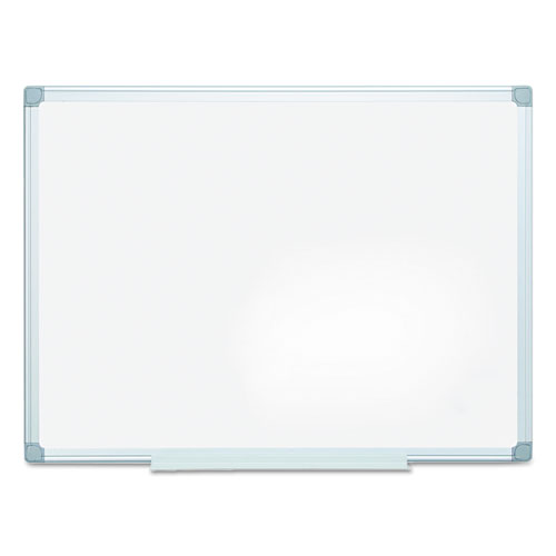 The MasterVision™ Earth magnetic dry erase board combines the best in writing and cleaning performance with professional Maya frame quality. Made from recycled and recyclable materials, this board is suitable for extensive. The magnetic surface resists staining, ghosting and scratches, cleans easily. Framed in sturdy aluminum, it has an easy 4-corner mounting system that can be positioned either vertically or horizontally -- offering versatility when reconfiguring an office or where wall space is limited. The adjustable aluminum pen tray offers a convenient way to keep your writing utensils within quick reach.