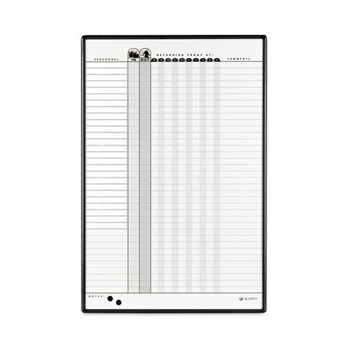 Personnel board tracks in/out status and notes of your employees on an ultra-durable, ultra-smooth DuraMax® porcelain surface that will not scratch, dent, stain or ghost. Delivers superior performance when communication is needed in high-profile, heavy-use office environments. Steel-backed porcelain creates magnetic surface for posting documents. Effectively display information on easy-to-read grid lines with alternating gray shading. Easy-to-clean writing surface requires minimal use of Quartet® cleaning solutions. Easily secure board to wall with included mounting system. Contemporary black aluminum frame complements any office decor. Includes accessory magnets and one marker.