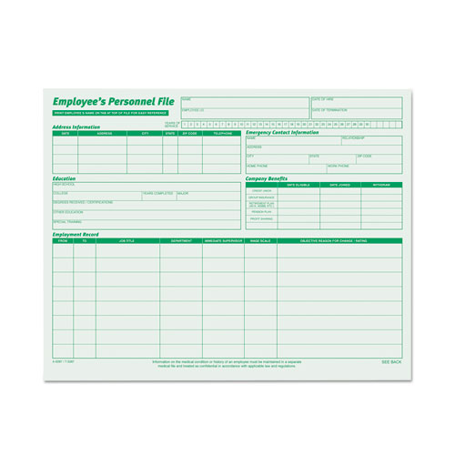 File folders include all you need to build a complete employee record in a legal manner. Update employee history and status on front, confidential material on back. Post Hiring Inquiry guides when insurance, Social Security, benefit plans, bonding, etc. may legally be asked. Open sides; can be inverted for confidentiality. Index stock.