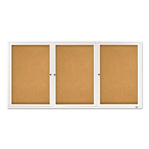 Enclosed Indoor Cork Bulletin Board with Three Hinged Doors, 72 x 36, Tan Surface, Silver Aluminum Frame