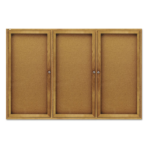 Enclosed Indoor Cork Bulletin Board with Three Hinged Doors, 72 x 48, Tan Surface, Oak Fiberboard Frame