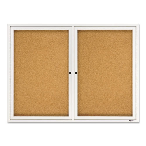 Enclosed Indoor Cork Bulletin Board with Two Hinged Doors, 48 x 36, Tan Surface, Silver Aluminum Frame