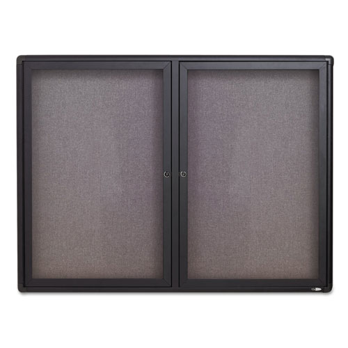 Enclosed Indoor Fabric Bulletin Board with Two Hinged Doors, 48 x 36, Gray Surface, Graphite Aluminum Frame