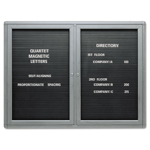 Protect and preserve important communications with the Quartet® Radius Design Letter Directory. The shatterproof window and locking door make the enclosed letter board an ideal place to safely display messaging in indoor environments. The hard-working surface holds messages securely in place. White plastic letters (sold separately) stand out on a solid black background for maximum readability. The durable, powder-coat finish delivers long-lasting, attractive performance. The lightweight, aluminum frame helps makes the directory easy to install.
