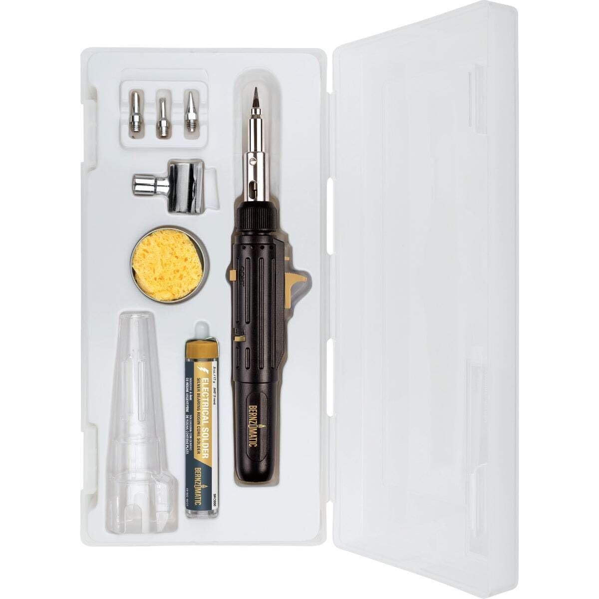 Precision that fits in the palm of your hand. Designed for fine detail projects such as electrical soldering, jewelry repairs, craft projects and heat shrinking wire, this torch kit is versatile and mighty. Kit includes Detail torch, 7 interchangeable tips, cleaning sponge, electrical solder, and storage case. Fuel not included