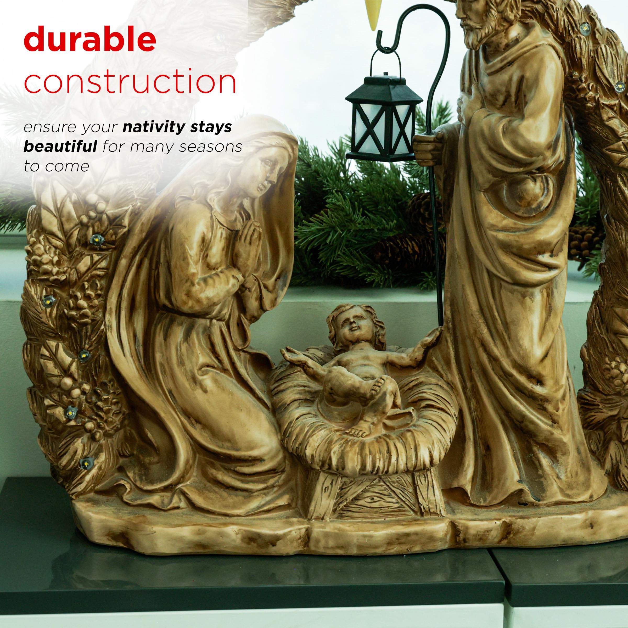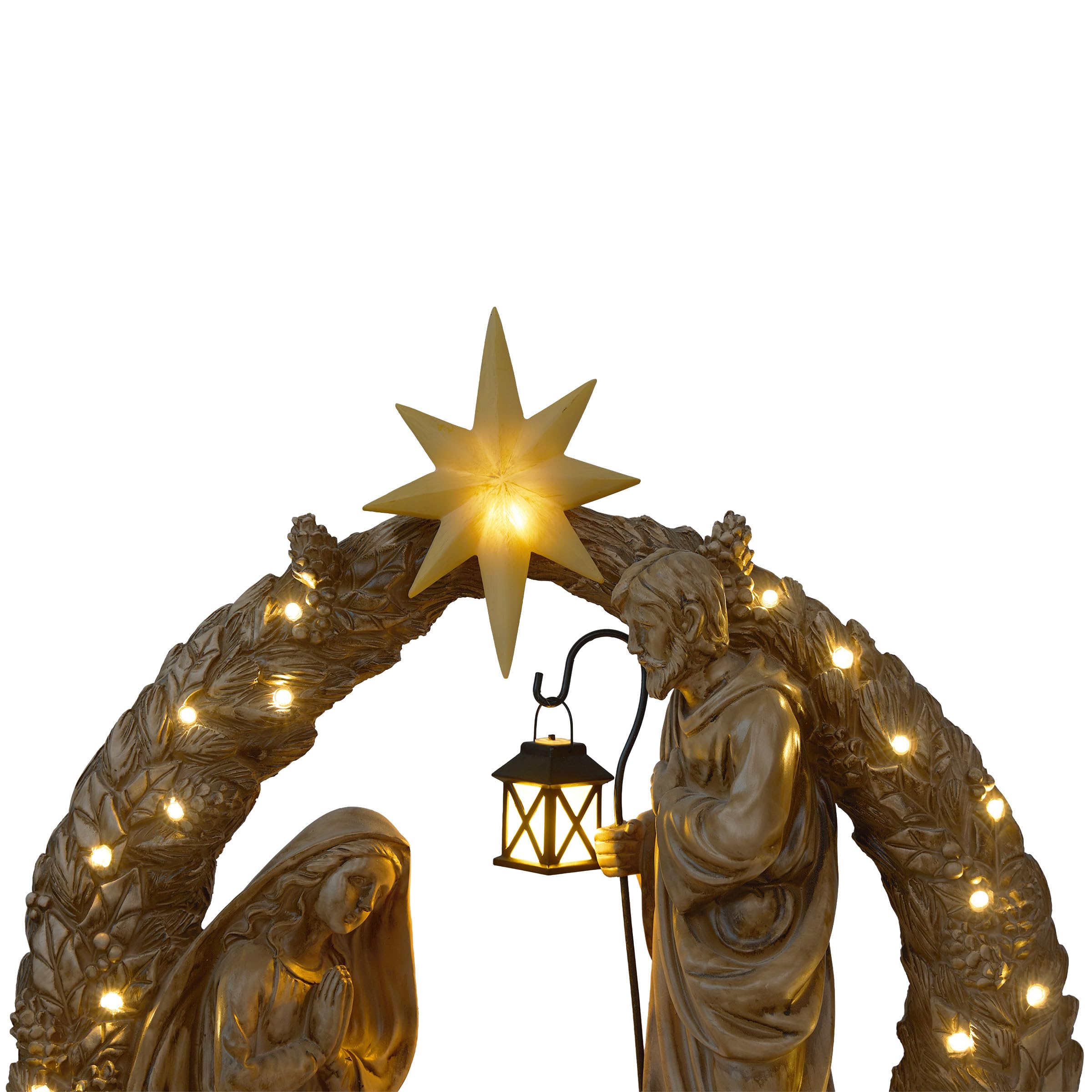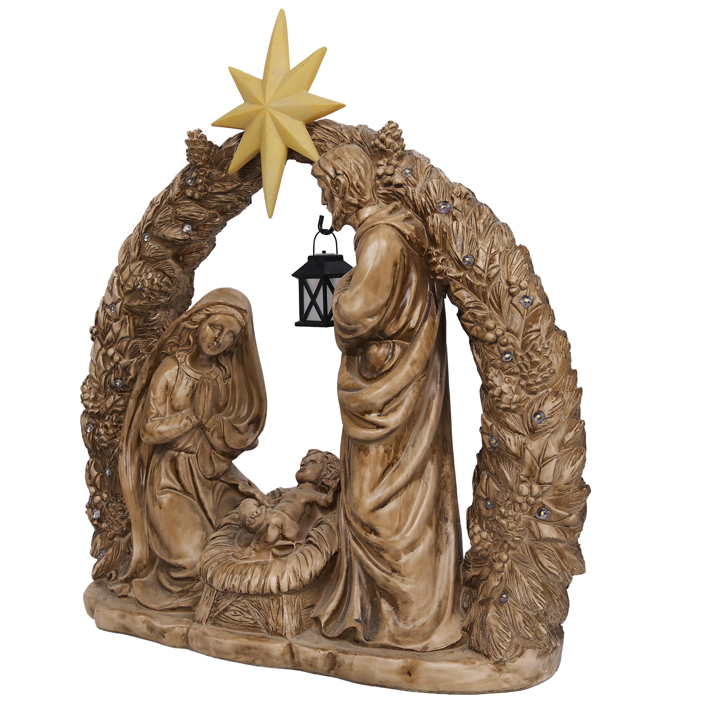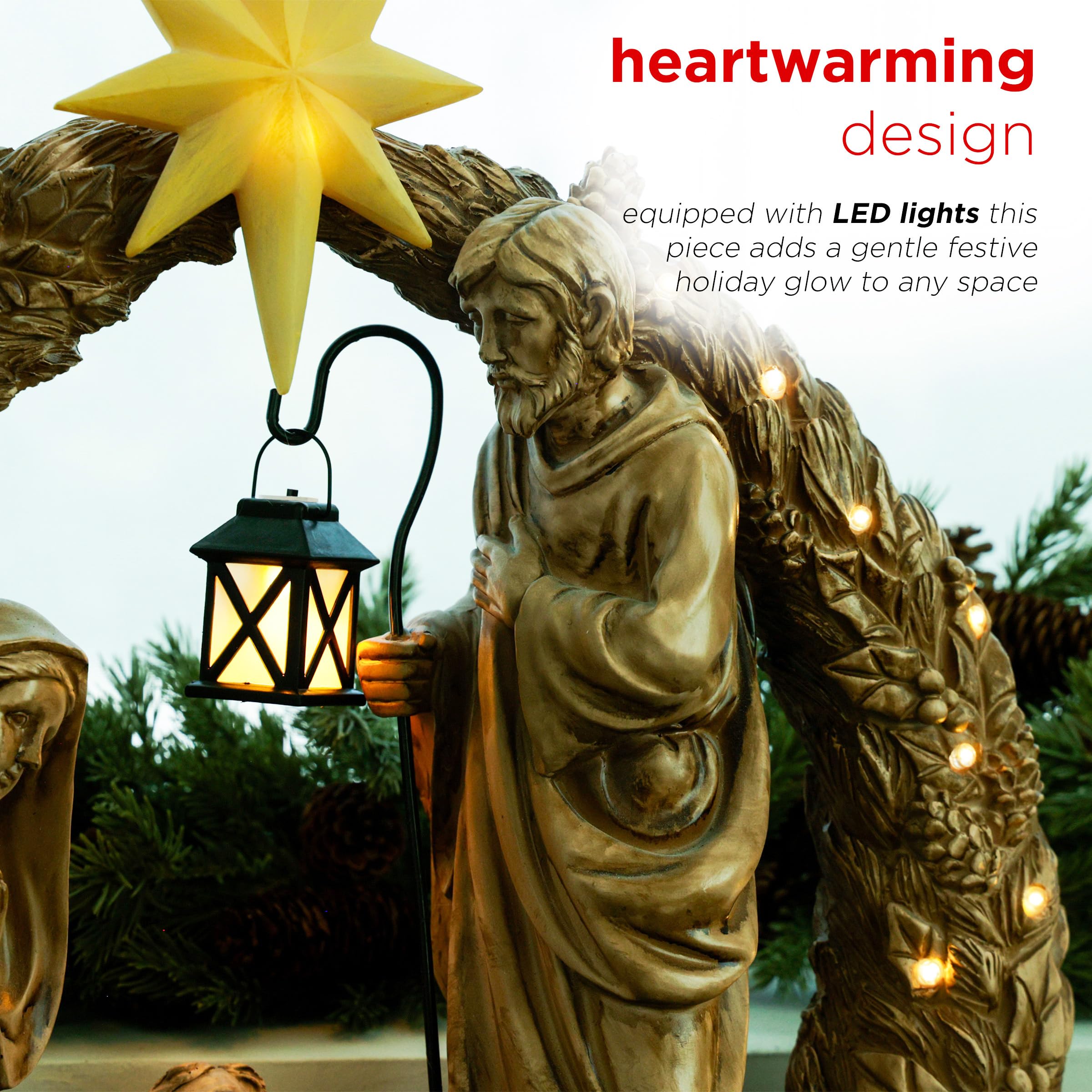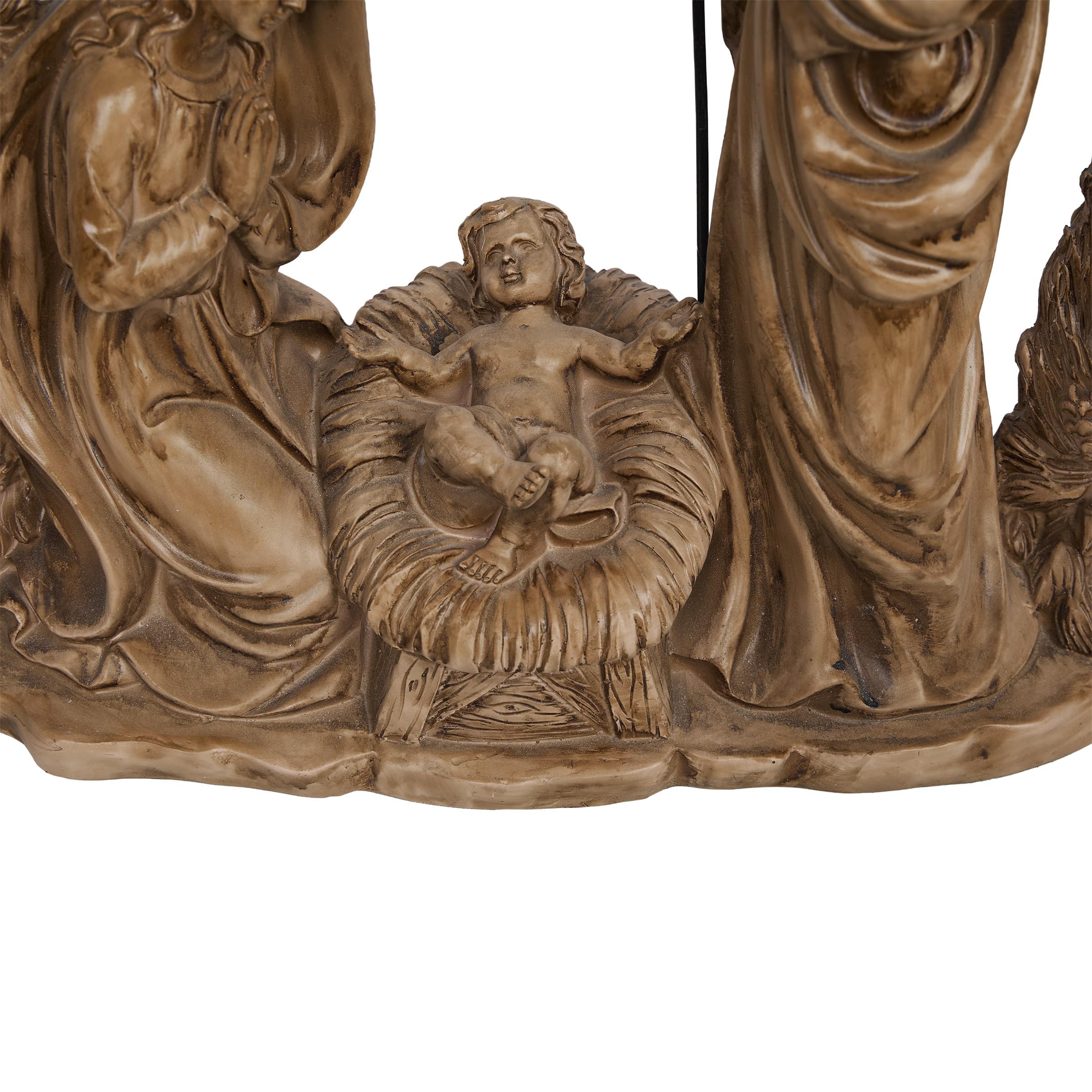 Celebrate the magic of Christmas with our delightful Holiday Nativity Scene Statuary. This charming small version measures 24 in. L x 9 in. W x 25 in. H, making it perfect for tabletops, mantels, or cozy corners in your home. Adorned with 21 warm white LEDs, this statuary beautifully illuminates the sacred scene, creating a peaceful ambiance that evokes the spirit of the season. Each figure is thoughtfully crafted, reflecting the love and joy of the Nativity story. Powered by 2 AA batteries (not included), it offers convenient placement options, allowing you to enhance your festive decor without the hassle of cords. Make this enchanting piece a treasured part of your holiday traditions, inspiring warmth and togetherness.