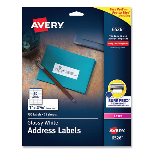 Glossy White Easy Peel Mailing Labels W/ Sure Feed Technology, Laser Printers, 1 X 2.63, White, 30/sheet, 25 Sheets/pack
