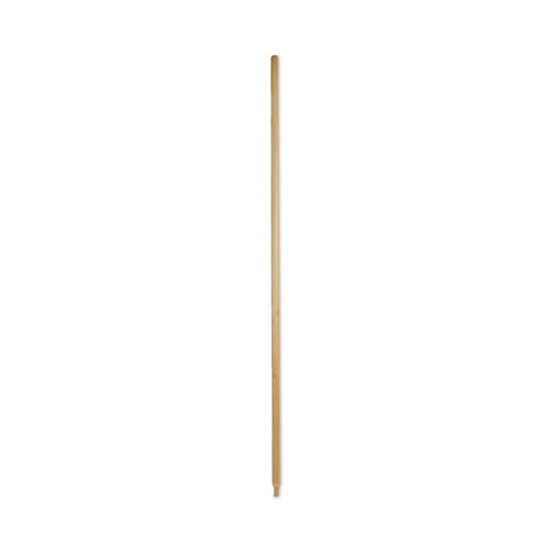 Precision-cut, threaded end broom handle. Natural colored, lacquered hardwood handle with smooth finish that resists splintering and is comfortable for extended use. Composed of solid hardwood for maximum durability and dependability for heavy-duty use applications. The rounded tip makes maneuvering and transport easy. Compatible with wood block brooms that accept a threaded handle, which are sold separately.