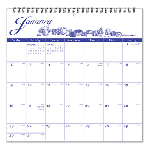 Enjoy a new illustration each month. One month per page with unruled blocks; past and future months reference. Framed with heavyweight gray backboard; wirebound with center hole punch. High-quality paper features superior ink bleed resistance