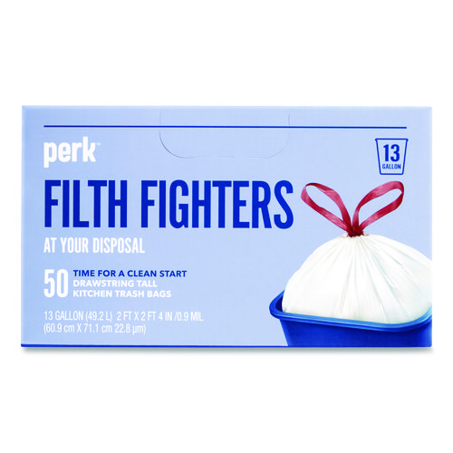 Drawstring Tall Kitchen Trash Bags, 13 gal, 28" x 24", White, 50/Box