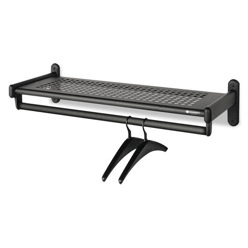Durable garment shelf with evenly indexed hanger rail secures to any wall to keep garments separate and neatly organized. Perforated shelf above the rack adds additional storage. Attractive black steel complements any environment. Pair with Quartet® hangers for complete garment storage. 100% Satisfaction Guaranteed.