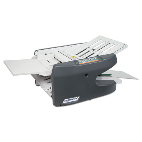 The 1811 paper folding machine fills the gap between larger standalone and smaller desktop models, making it ideal for mail-rooms, offices, churches, schools, businesses and associations. Fast and reliable, it automatically feeds, folds and collects up to 12,000 sheets per hour. Fully enclosed, manually adjustable fold tables ensure quieter operation and improved operator safety. Fully automated, its large rubber rollers deliver consistent, trouble-free feeding, and its durable conveyor belts create easy-to-handle, fanned stacks. Adjustable first (2" to 11.5") and second (1.5" to 5.75") folds provide the flexibility you need to accommodate a wide range of applications. Manual bypass allows you to fold stapled sets of up to five sheets. Onboard feed table holds up to 300 sheets of 20 lb bond.