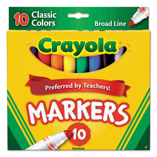 Classic, long-lasting, durable markers lay down lots of brilliant color. Great for coloring, drawing and art projects. True-to-color inks that do not smudge or bleed through paper. Broad conical tips fill in large areas as well as produce thin lines and dots. Colored barrels make it easy to identify the ink color. Come packaged inside a sturdy box with a cut-out window to view the colors before using.