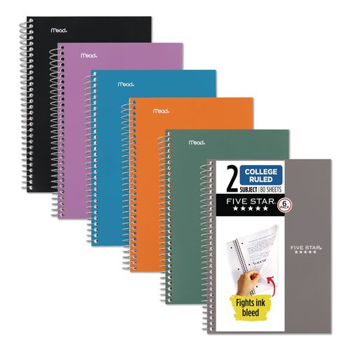 Wirebound Notebook, 2-Subject, Medium/College Rule, Assorted Cover Colors, (80) 9.5 x 6.52 Sheets, 6/Pack