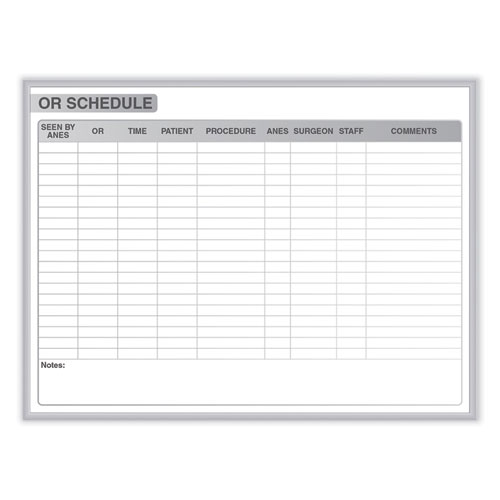 Ghent's graphic whiteboard is visually enhanced to encourage communication and collaboration. Ghent's OR schedule board helps keep track of surgeries and patient details for your operating room. There is plenty of room to write in each patient's procedure details. The graphics on the erasable board improves communication and reduce anxiety for patients and employees. The entire dry-erase surface easily wipes off with a soft cloth, disinfectant wipe, alcohol or water. Ghent's graphic whiteboards are resistant to bacteria and germs, which helps with infection prevention. Each board comes in a sleek 0.25 aluminum frame and includes a detached SmartPak tray. Graphics are produced in gray to seamlessly match any interior and will never stain, ghost or fade. Ships to you in Ghent's worry-free packaging, designed specifically for shipping whiteboards.