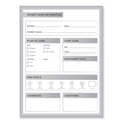Ghent's patient room whiteboard is visually enhanced and will not ghost or stain. Soft gray graphics blend with hospital design and the researched design encourages patient and staff communication, effective in increasing HCHAPS scores and reducing patient anxiety. There is plenty of room to write in each patient's procedure details. The graphics on the dry-erasable boards improve communication and reduce anxiety for patients and employees. The entire surface easily wipes off with a soft cloth, disinfectant wipe, alcohol or water. Ghent's graphic whiteboards are resistant to bacteria and germs, which helps with infection prevention. Each board comes in our sleek 0.25 aluminum frame and includes a detached SmartPak tray. Ships to you in Ghent's worry-free packaging, designed specifically for shipping whiteboards.