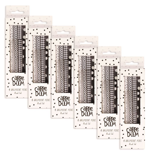 Carpe Diem Ballpoint Pen, Stick, Medium 0.7 mm, Black Ink, Assorted Geometric Barrel Patterns, 4 Pens/Pack, 6 Packs/Box