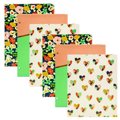 Two-Pocket Portfolio Folder, 1" Capacity, 9.6 x 11.9, Floral/Geometric/Hearts, 6/Pack
