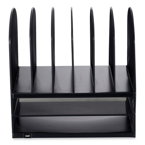 This organizer features a USB port to easily charge your electronics. Durable, designed with steel mesh construction. A versatile filing center that is designed with two horizontal trays for letter-size documents and six large-capacity vertical sections for file folders and binders. Includes USB cord and power cord to plug into wall.
