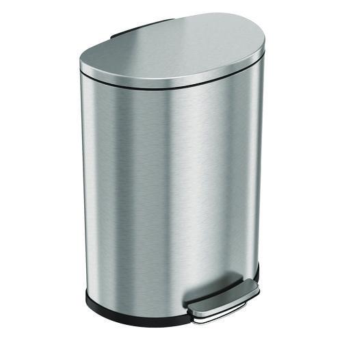 Step Pedal Trash Can, 13 gal, Half-Round Plastic/Stainless Steel, Silver