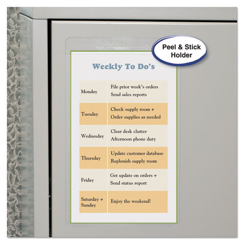 Peel and stick holders stick wherever they are needed. Super-heavyweight, PVC-free poly holders become self-adhesive when the back liner is peeled away. They are ideal for convenient storage of instructions or service records on office equipment. The holders are also an excellent way to post signs and clean logs throughout your facility. The welded, non-rip seams hold up in rough environments. Use holder to permanently attach instructions or service records to any flat surface.