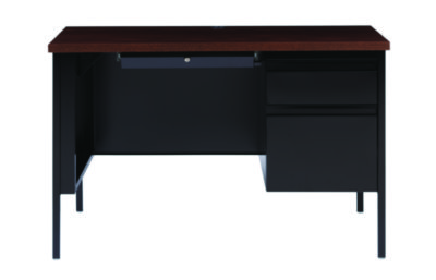 Solid and stable desk with square edge laminated top that is scratch- and stain-resistant. Built with a durable, powder-coated steel frame with 1" square tubular steel legs. Standard features include full extension ball-bearing drawer slides for smooth drawer action, central locking center drawer, and a strong laminate wood top. Desks ship fully assembled except for the legs. All necessary hardware to attach the legs is included. Designed to meet or exceed ANSI-BIFMA industry standards for performance and workmanship.