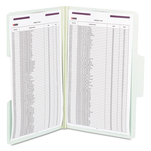 Find critical files fast with SuperTab® pressboard fastener folders. Get nearly double the labeling area of a standard fastener folder, so you can write larger or use more lines of description. Protect your documents and fingers with SafeSHIELD® coated fastener technology, the ultimate solution to fastener issues, including paper tears, finger cuts, and excessive fastener crinkling. Fasteners in positions 1 and 3. Sturdy tear resistant gusset expands to hold up to 2" of material. Made from heavy-duty pressboard material to handle large, bulky files that get plenty of use.