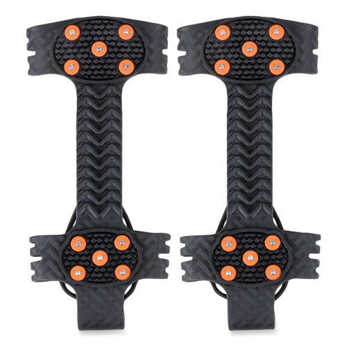 The TREX 6310 Adjustable Slip-On Ice Cleats are lightweight ice grips for boots and shoes that provide tenacious traction and extra stability on ice and snow. Stretchable one-piece design offers grip to prevent slip and fall injuries on the ice. These ice grippers feature 10 rugged carbon steel cleats on the ball and heel of foot for grip on slippery terrain. Aggressive trade connects mid-foot and heel stud zones for extra traction. Available in multiple sizes and will fit over any style of boot or shoe for traction and stability during winter work or other winter outdoor activities. Tested to be flexible in temperatures down to -40°F (-40°C), the stretchable rubber material provides a secure fit and easy slip-on/off wear. An adjustable cord cinches tight for a secure fit. Reflective pull-on tab on these ice traction cleats adds enhanced visibility. These snow cleats are lightweight and can be folded small enough to be stored in a pocket or pack when not being worn.