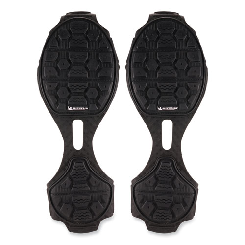TREX Spikeless Traction Devices for shoes reduce the risk of slips and injuries by providing spike-free traction on slick surfaces. Powered by Soles by Michelin, these are the industry's most advanced spikeless traction device. Designed for work environments where spiked ice cleats are not preferred, these shoe and boot grips make for easy and safe transition between indoor and outdoor. To achieve traction without spikes, the treads are constructed with a Michelin ice control compound, the same innovative technology found in their winter driving tires. Strategically placed grooves allow for efficient water evacuation when pressure is applied. Preventing water build up is particularly beneficial on smooth indoor surfaces. Micro-pumps increase adhesion by properly distributing pressure to maintain high surface contact on icy surfaces. The tread is designed with block sipings that create additional surface area for increased grip on snowy surfaces.