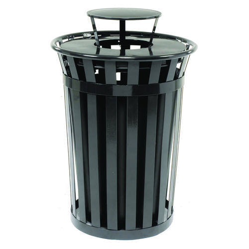Outdoor Slatted Steel Trash Can, Rain Bonnet Lid, 36 gal, Black
