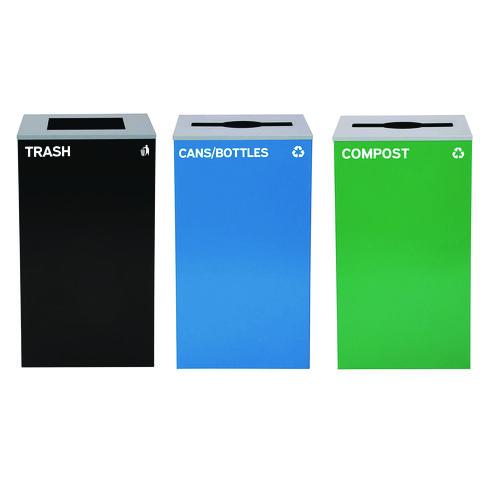 29 Gallon Trash/Recycling Cans, Steel, Blue Cans/Bottles Recycling and Green Compost Can w/Mixed Lid, Black Trash Can Sq Lid