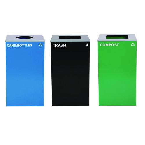 29 Gallon Trash/Recycling Cans, Steel, Blue Cans/Bottles with Circle Lid, Green Compost and Black Trash Cans with Square Lids